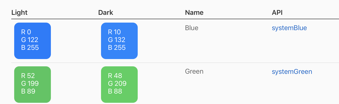애플문서에선 rgb값이 아래와 같이 조금 다르게 표현한 색깔이라고 하네요!