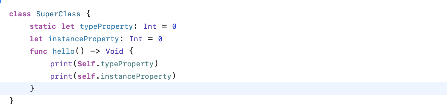 대문자로 시작하는 Self 타입은 말 그대로 SuperClass와 SubClass 타입을 가리키고 있고, 소문자 self 프로퍼티는 SuperClass와 SubClass의 인스턴스들을 가리키고 있는 것입니다!!