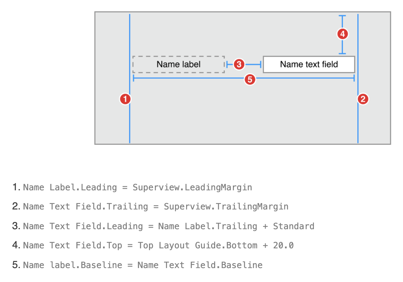 NameLabel이나 NameTextField는 Top에서 최소 20만큼은 떨어져있어야하고 둘은 baseline이 같아야 합니다. 둘 중에서 하나의 폰트 크기가 커진다면, 다른 하나의 Top Constraint는 20보다 커져야 합니다. 그 반대의 경우도 마찬가지입니다. 따라서 아래의 제약조건들을 추가해주면 됩니다.